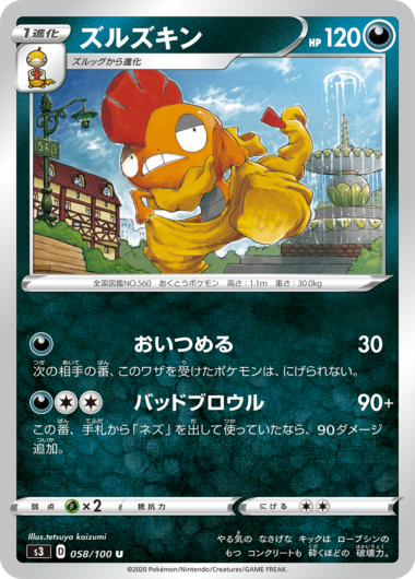 《ズルズキン》は《ネズ》を使用したターンに「180」ダメージになる『バッドブロウル』が特徴的です。