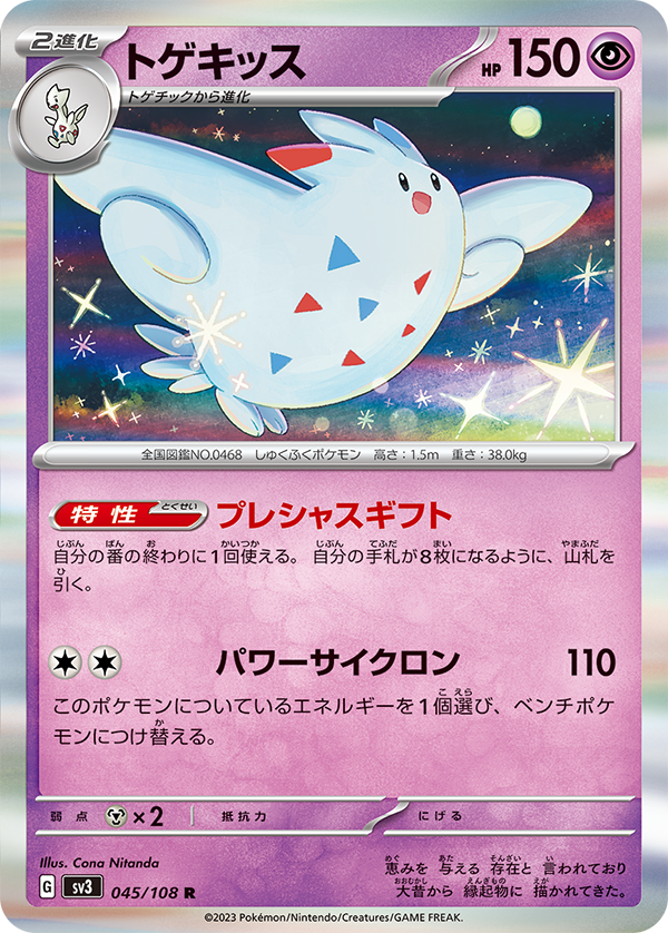 2進化の《トゲキッス》は特性「プレシャスギフト」によって、番の終わりに手札が8枚になるように山札を引けます。