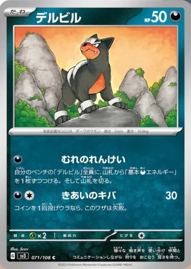 エネルギーをベンチポケモンに付け替えられるワザ「ナイトサイクロン」が特徴のたねポケモンです。