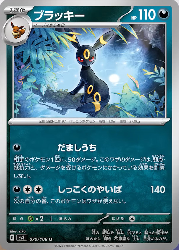 《ブラッキー》はワザ「だましうち」が特徴。弱点・抵抗力・かかっている効果を計算せずにポケモン1匹に50ダメージを与えられます。