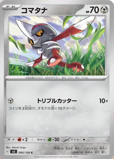 《コマタナ》はHP70でにげるエネルギーが1つの扱いやすいたねポケモンですが、同スペックで1エネルギーで確実に20ダメージを与えられる《コマタナ(白熱のアルカナ)》がライバルになるでしょう。