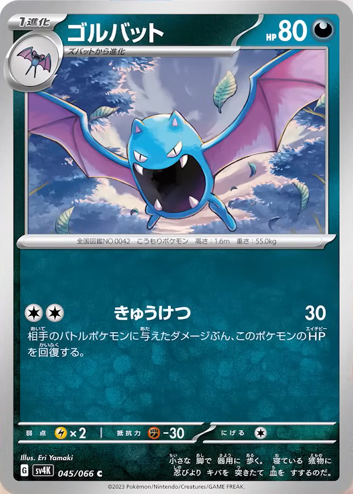 《ゴルバット》はワザ「きゅうけつ」でHPを回復しながら攻撃可能な1進化ポケモンです。