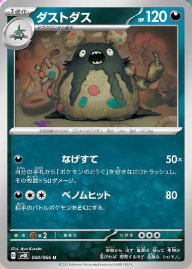 《ダストダス》が持つワザ「なげすて」は、手札から「ポケモンのどうぐ」を好きな枚数トラッシュし、その枚数×50ダメージを与えます。
