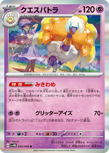 《クエスパトラ》は手札から出して進化した時、特性「みきわめ」によって、次の番の終わりまで相手のポケモンからワザのダメージや効果を受けません。